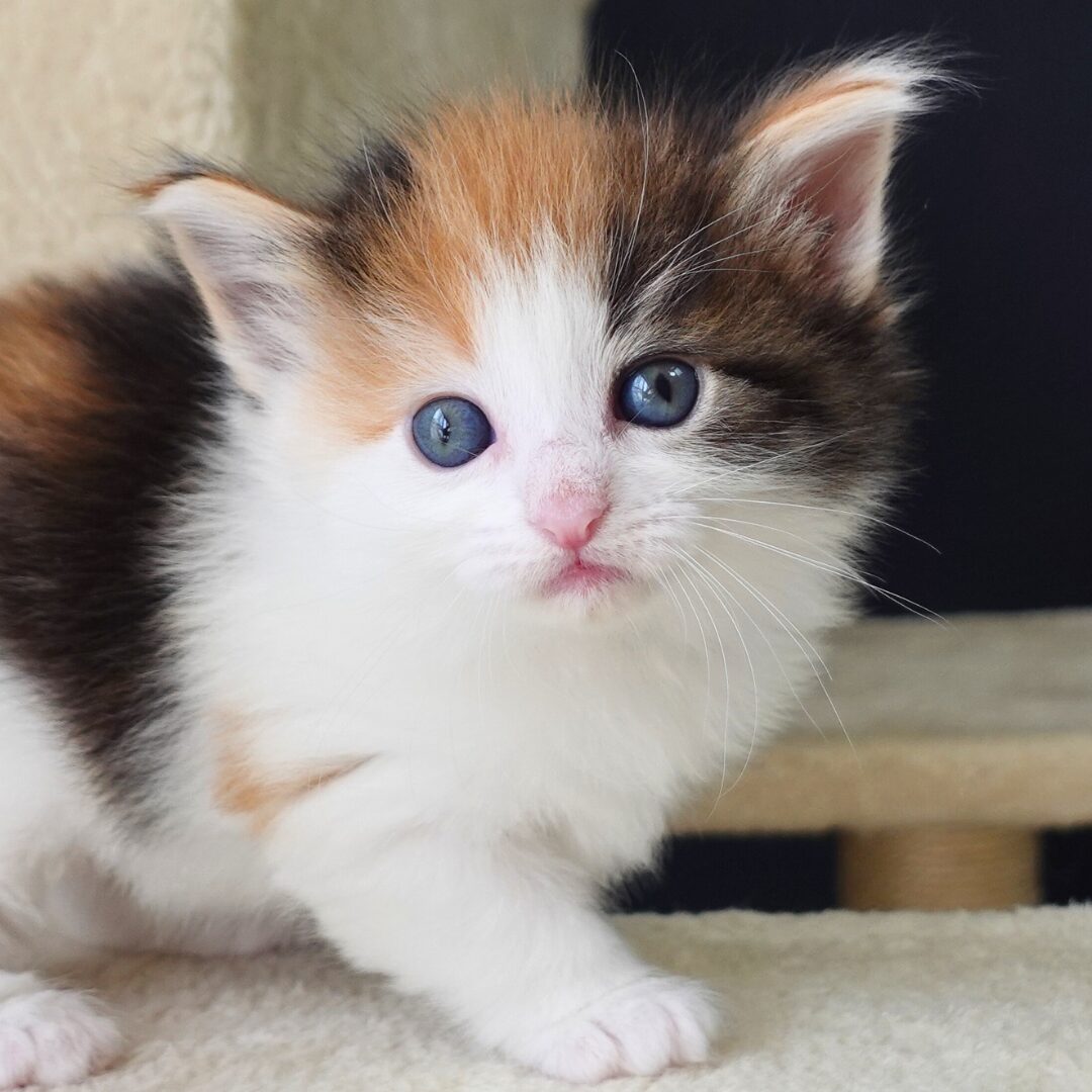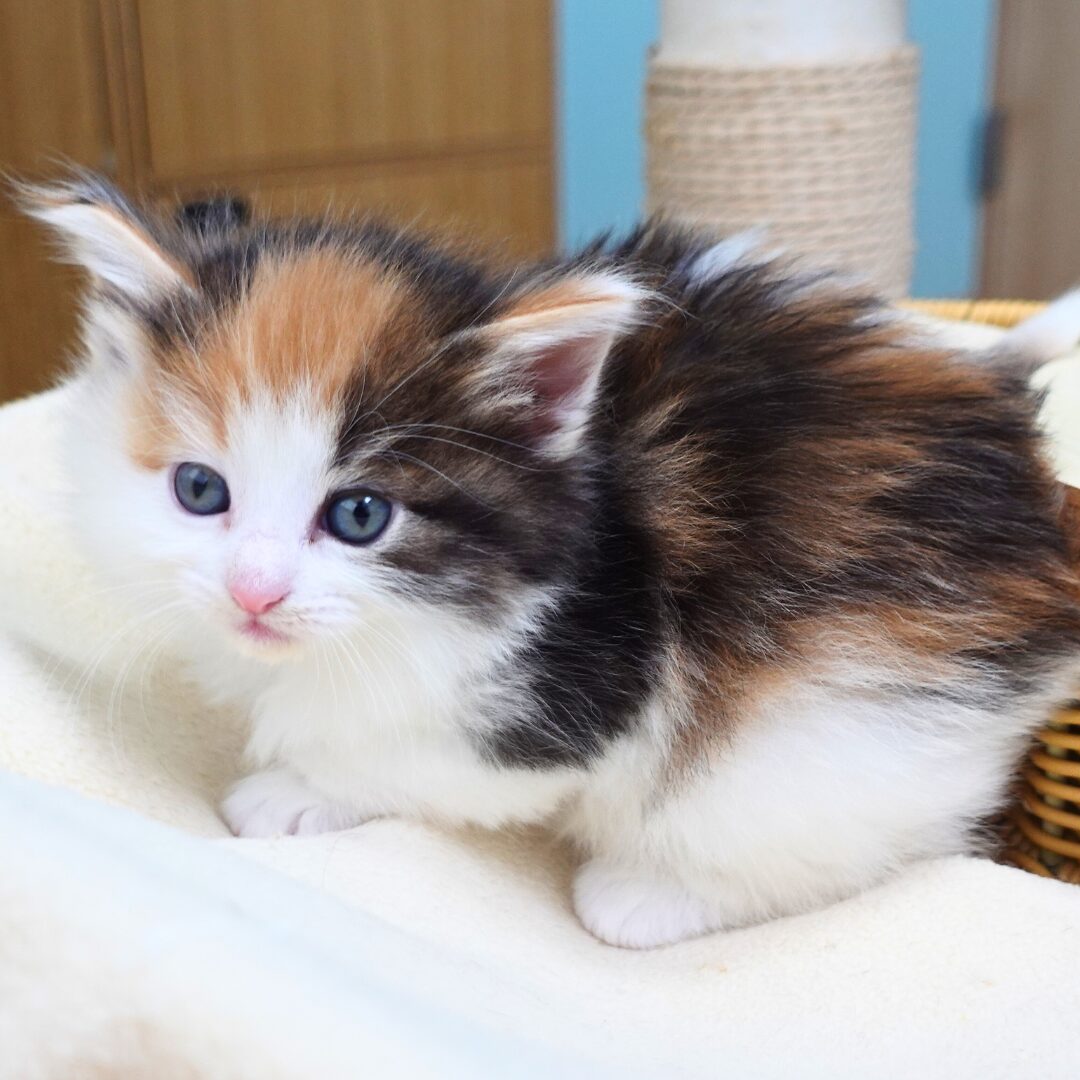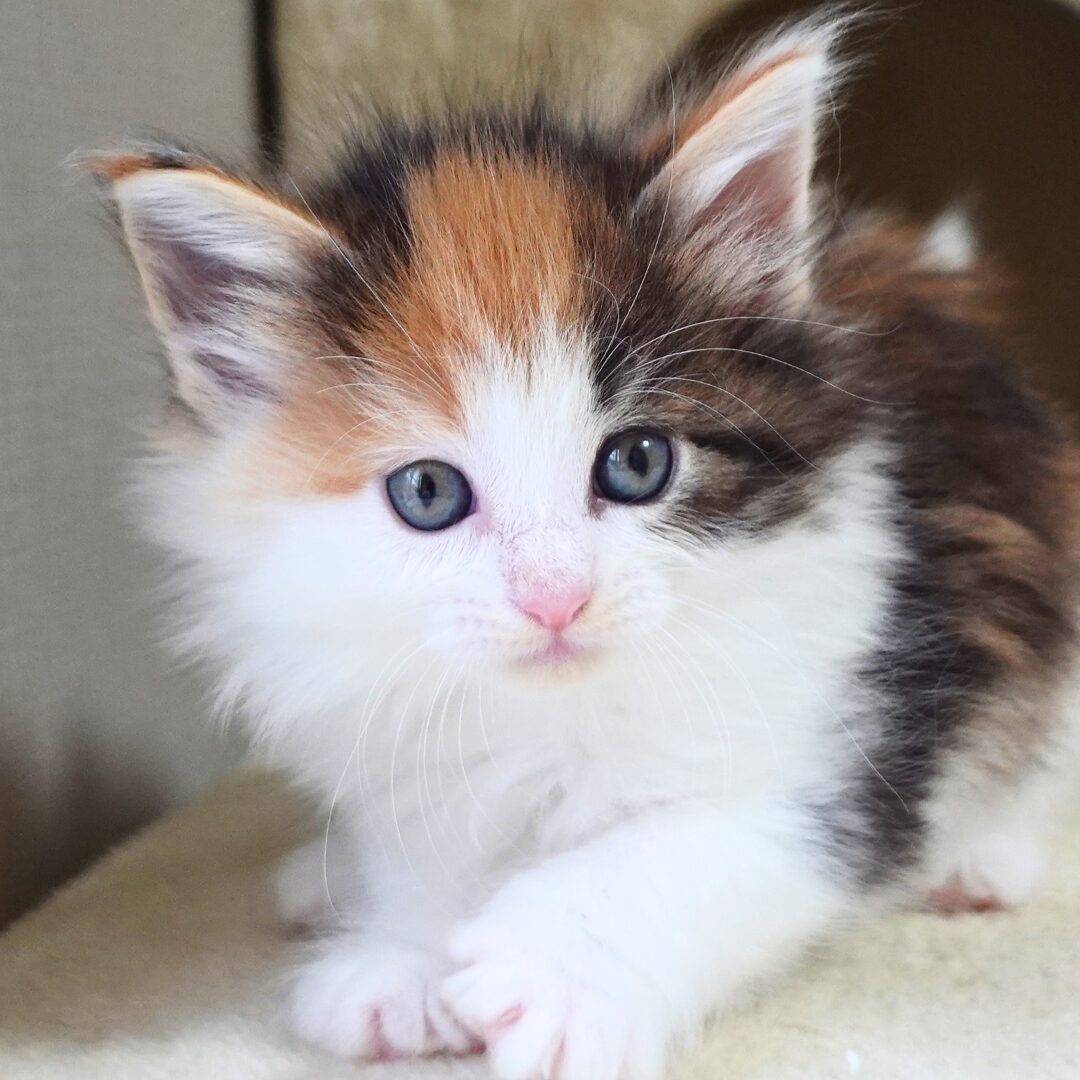 全身に広がる華やかな三色の被毛に、胸元や足先の白い毛並みが加わり、明るく上品な雰囲気をいっそう引き立てています🌸