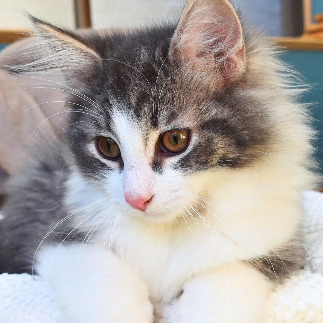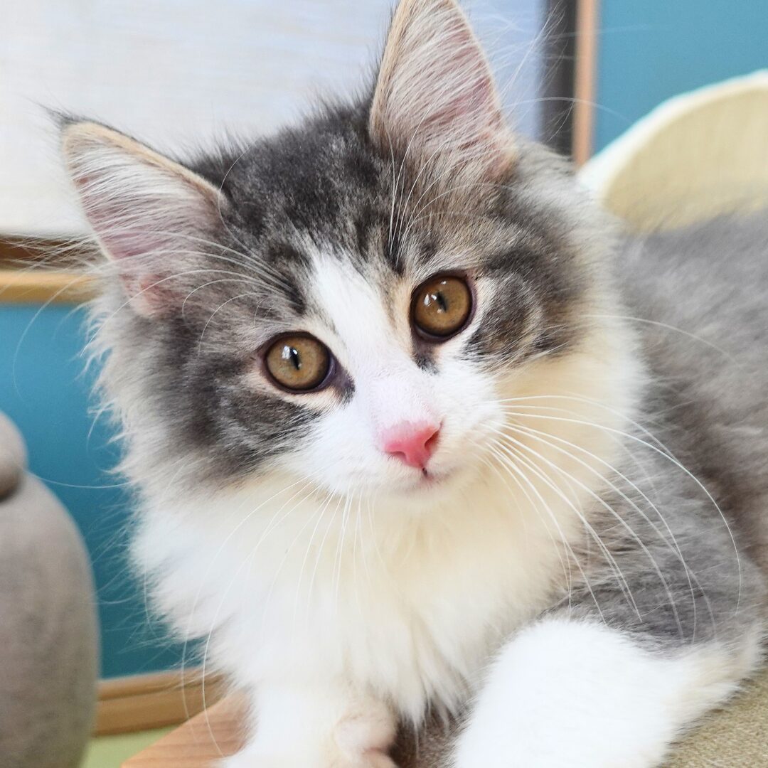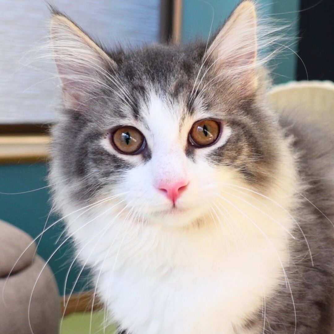綺麗なハチワレ模様に、眼の周囲をふんわり囲む青いラインがとっても魅力的。