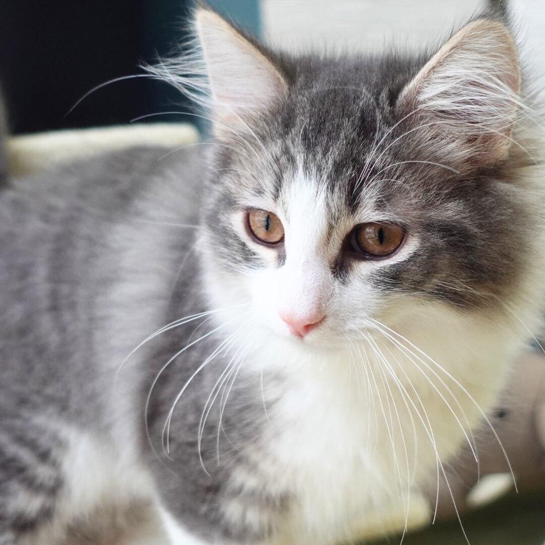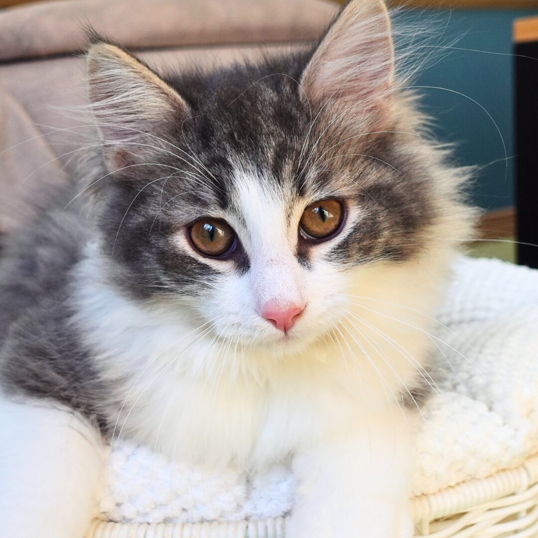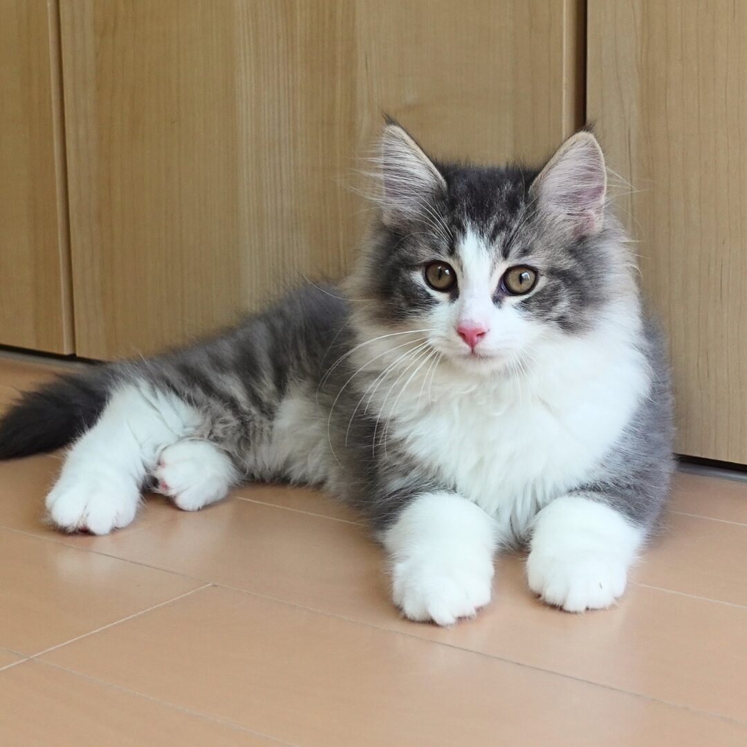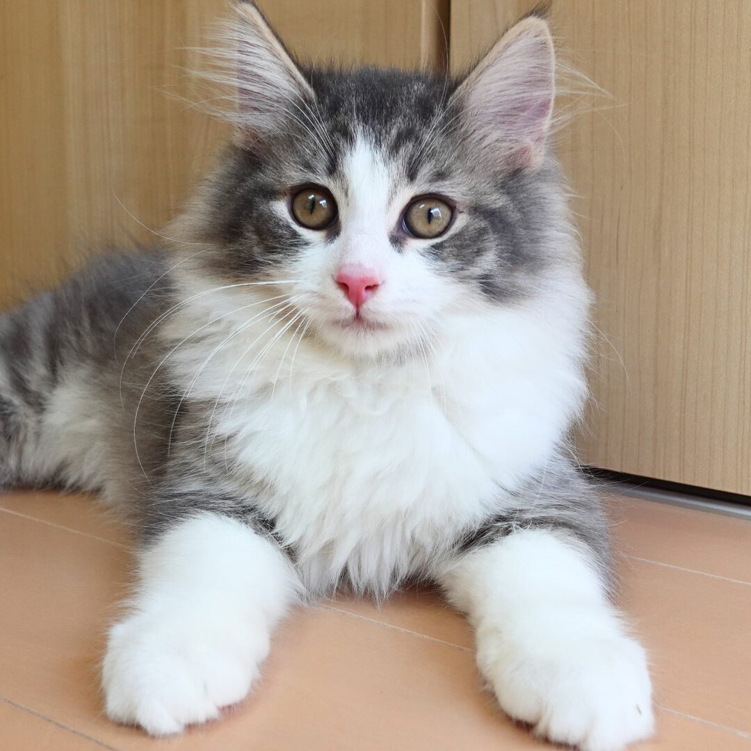 綺麗なハチワレ模様に、眼の周囲をふんわり囲む青いラインがとっても魅力的。