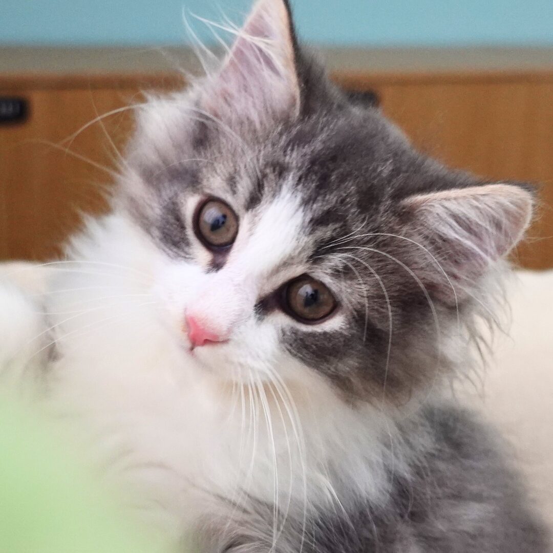 綺麗なハチワレ模様に、眼の周囲をふんわり囲む青いラインがとっても魅力的。